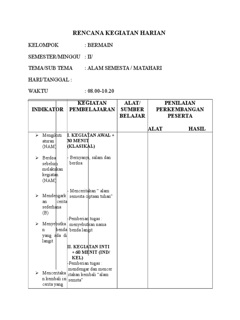Rkh Tk Semester 2 Tema Alam Semesta from data03.123doks.com Tema alam semesta subtema gejala alam dangan 4 sub sub tema nya semoga bermanfaat kritik dan saran kami harapkan untuk membangun konten yang lebih baik lagi. Rppm ini berlaku selama seminggu masa proses pembelajaran di kelas pada jenjang. Soal revisi sd smp sma. Contoh rpph kelompok usia 4 5 tahun tema negaraku dan alam. Seperti pada rpph paud beriktut ini dengan tema alam semesta subtema gejala alam berikut ini yang dapat ayah bunda download sebagai contoh atau referensi dalam penyusunan rpph paud yang ayah bunda kerjakan di lembaga/sekolah dimana ayah bunda mengajar. Untuk memudahkan proses pengajaran, disusunlah urutan kegiatan pembelajaran untuk tema surat subtema alat komunikasi ini. Belajardari rumah tema alam semesta subtema benda langit mata pelajaran untuk anak tk paud. Soal anak tk tema alam semesta.